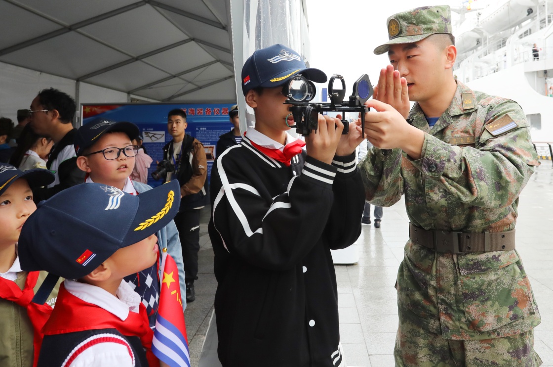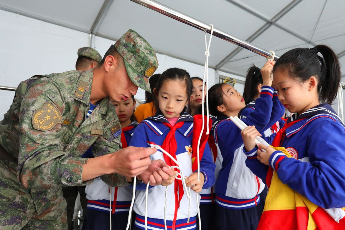 4月23日,海軍戰士在指導小朋友繩結的打法。新華社記者 方喆 攝