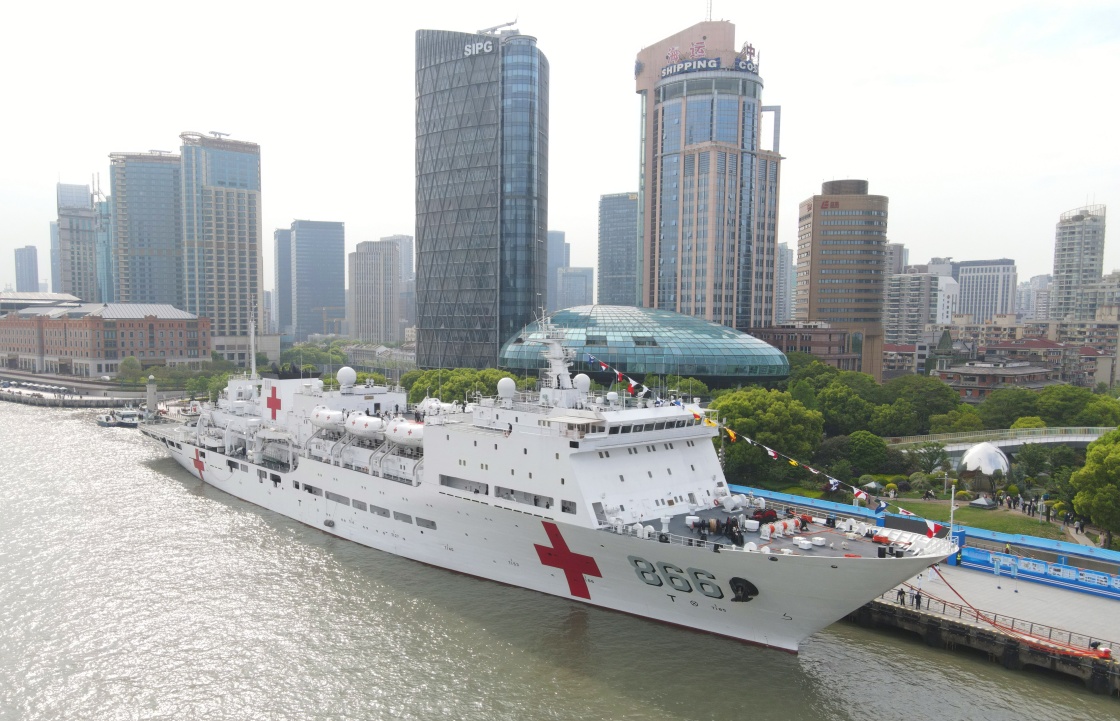 空中俯瞰靠泊在上海港國際客運中心碼頭的海軍淄博艦(左)和海軍“和平方舟”號醫院船(無人機照片,4月22日攝)。新華社記者 方喆 攝