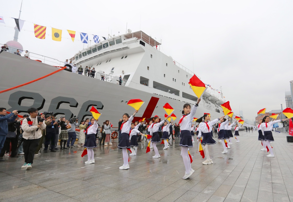 4月23日,2024年海軍成立紀念日艦艇開放活動在上海舉行。海軍淄博艦和海軍“和平方舟”號醫院船靠泊上海港國際客運中心碼頭。預約前來的市民游客不僅能登艦參觀,還可在碼頭舉行的系列活動中與海軍戰士面對面交流,感受人民海軍艦船的威武和海軍戰士的活力。