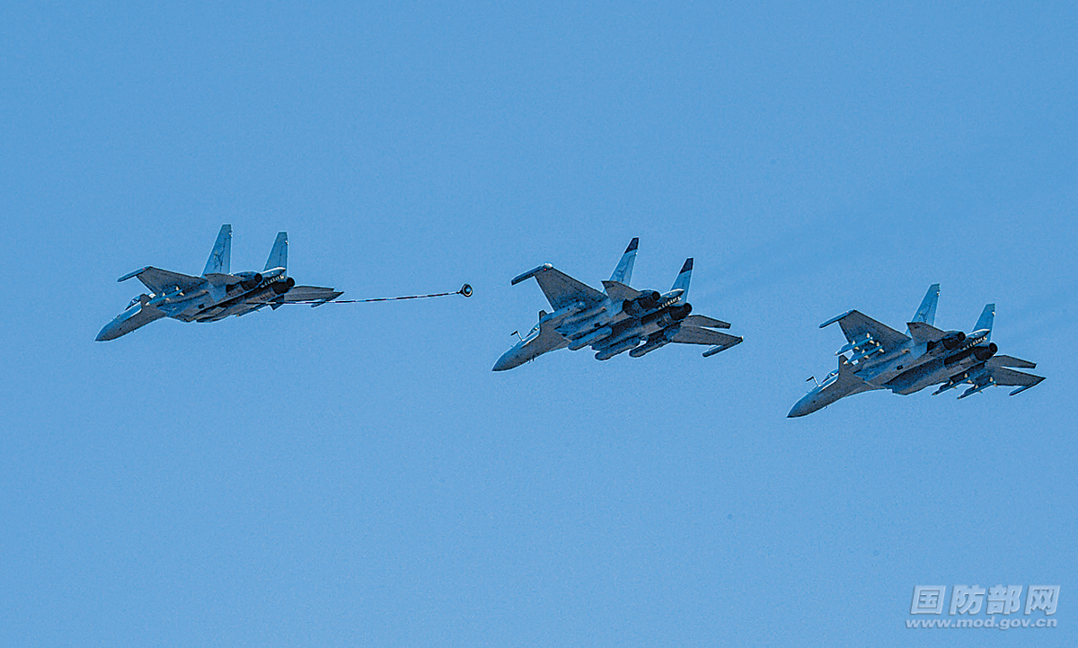 海軍殲-15系列艦載戰(zhàn)斗機(jī)編隊展示伙伴加油課目。