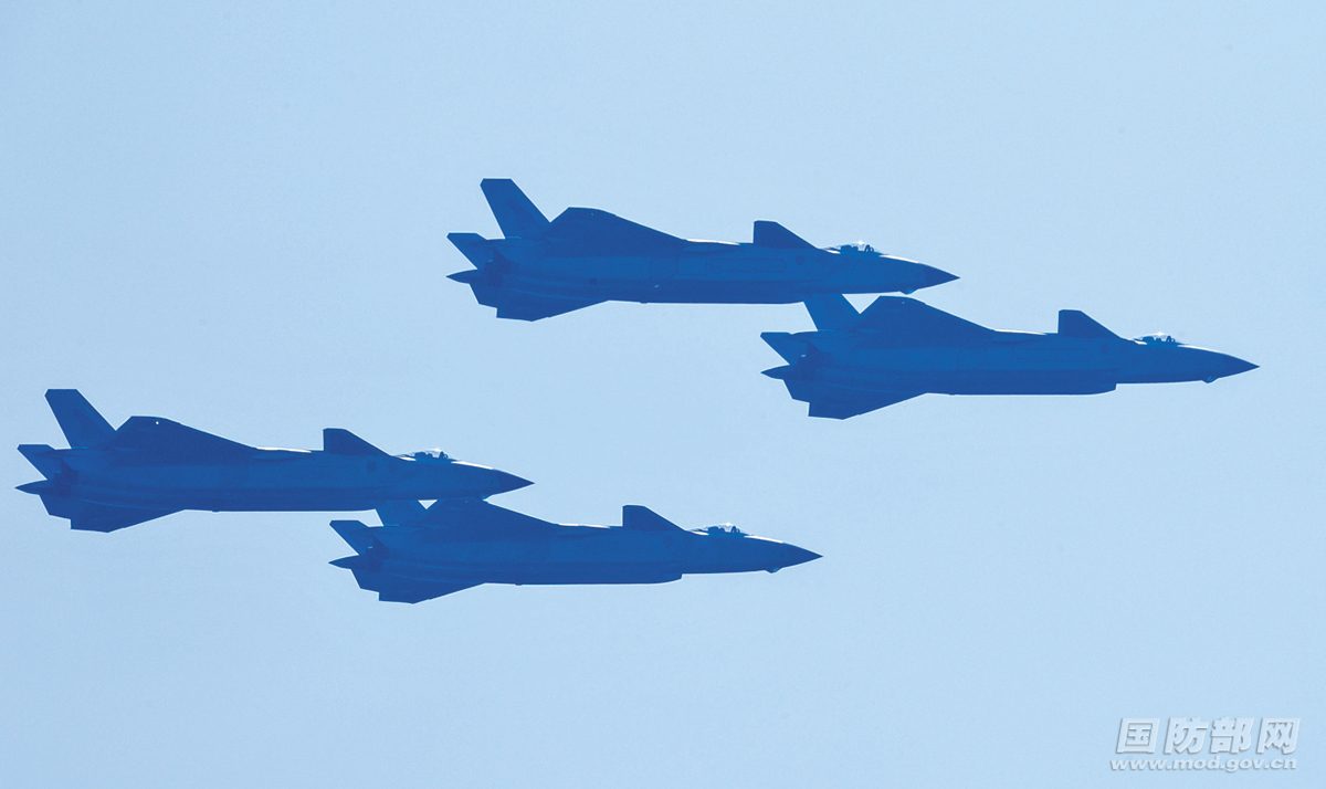 空軍殲-20戰(zhàn)機(jī)四機(jī)編隊飛行展示。
