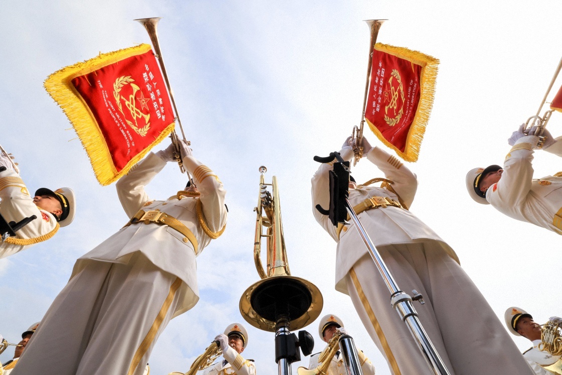 中國人民解放軍聯合軍樂團在進行訓練(8月12日攝)。新華社記者 張鋮 攝
