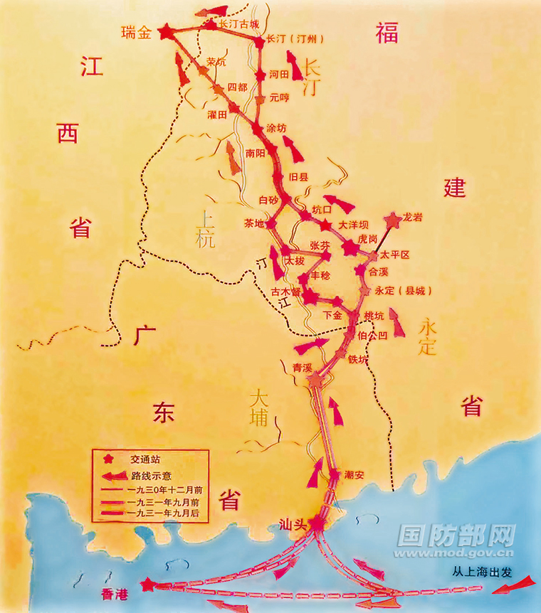 1930年,為加強與全國各革命根據地的聯系,黨中央成立中共中央交通局,開辟長江、北方和南方3條秘密交通線。其中,由中共中央機關駐地上海經香港、汕頭、大埔、永定、長汀到中央蘇區瑞金的南方交通線,是持續時間最長、發揮作用最大、最為隱秘的一條。它見證了傳遞大量中央和地方文件、情報資料,運送蘇區急需的物資和經費,安全掩護領導干部和優秀人才轉移到中央蘇區等任務的順利執行,被譽為“中央紅色交通線”。