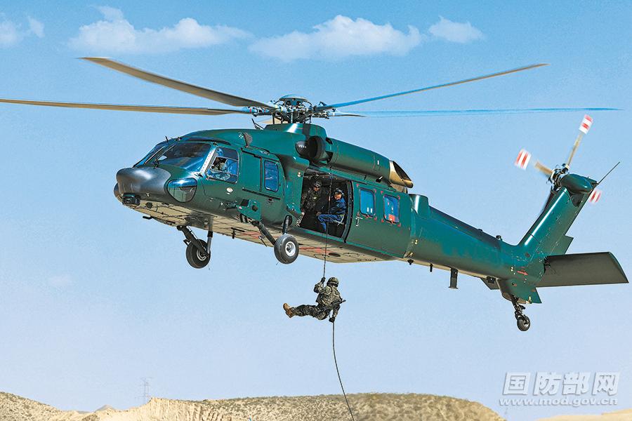 圖為戰(zhàn)士從直升機上索降。汪源 攝