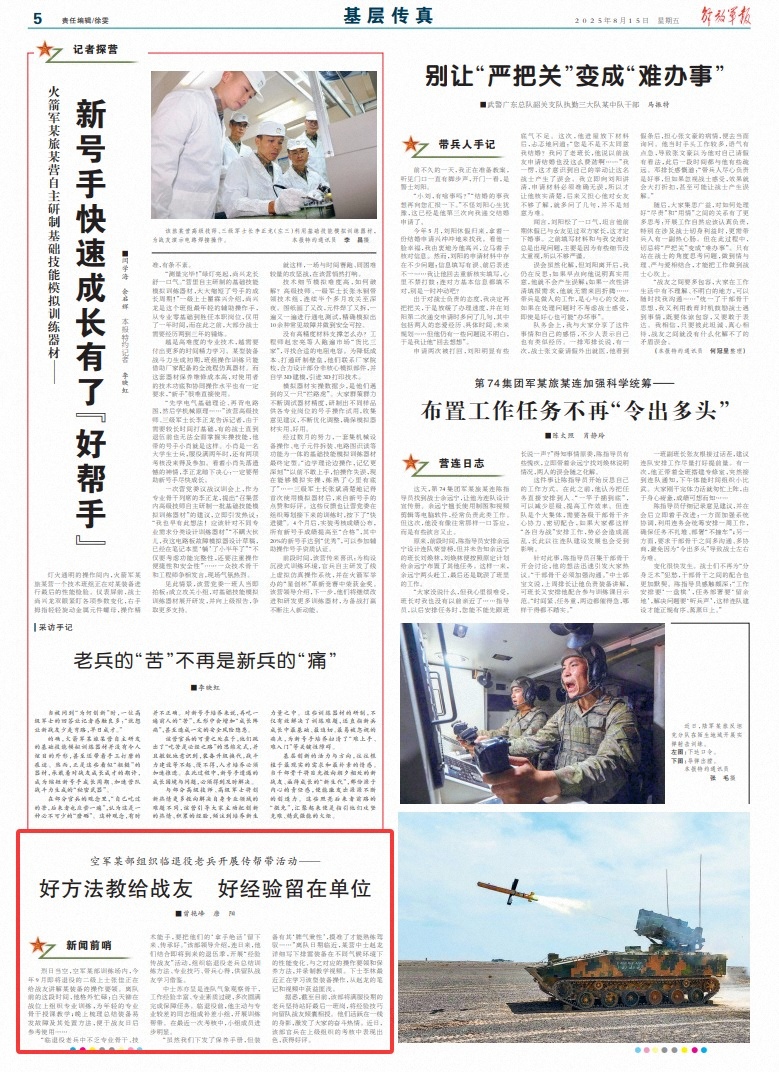 “臨退役老兵中不乏專業骨干、技術能手,要把他們的‘拿手絕活’留下來、傳承好?!痹摬款I導介紹,連日來,他們結合即將到來的退伍季,開展“經驗傳戰友”活動,組織臨退役老兵總結訓練方法、專業技巧、帶兵心得,供留隊戰友學習借鑒。