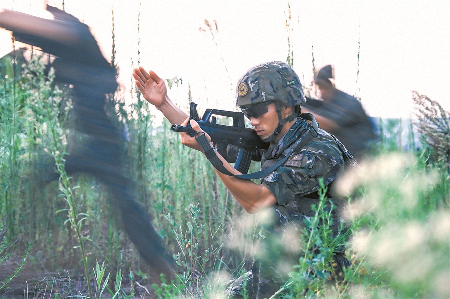武警第二機動總隊組織戰斗檢驗。圖為某中隊戰術小組正在進行追擊行動。