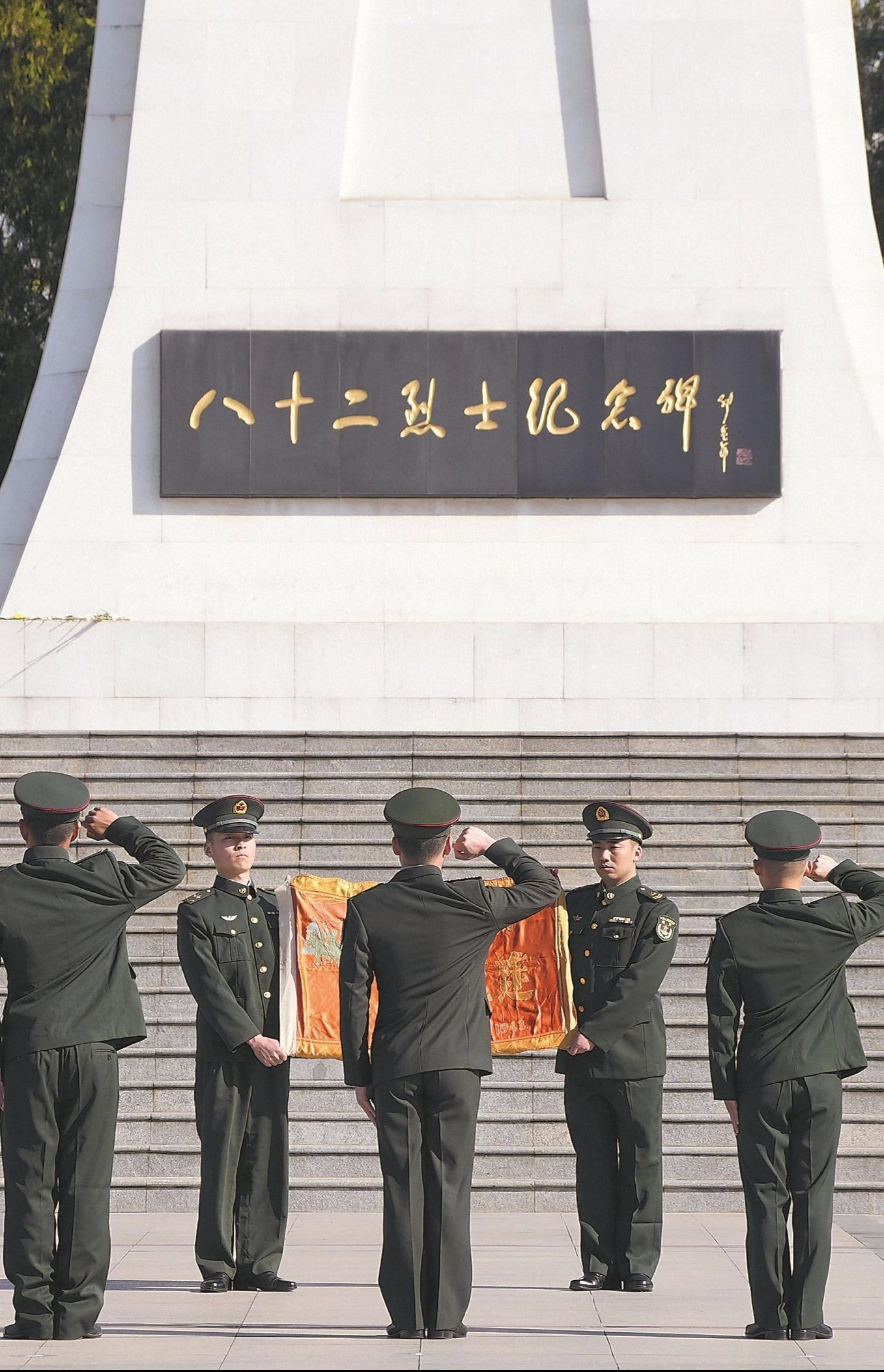 2025年3月18日,連隊(duì)官兵代表前往劉老莊八十二烈士陵園參加紀(jì)念活動(dòng)。圖為官兵代表在烈士紀(jì)念碑前向戰(zhàn)旗宣誓。楊仕偉 攝