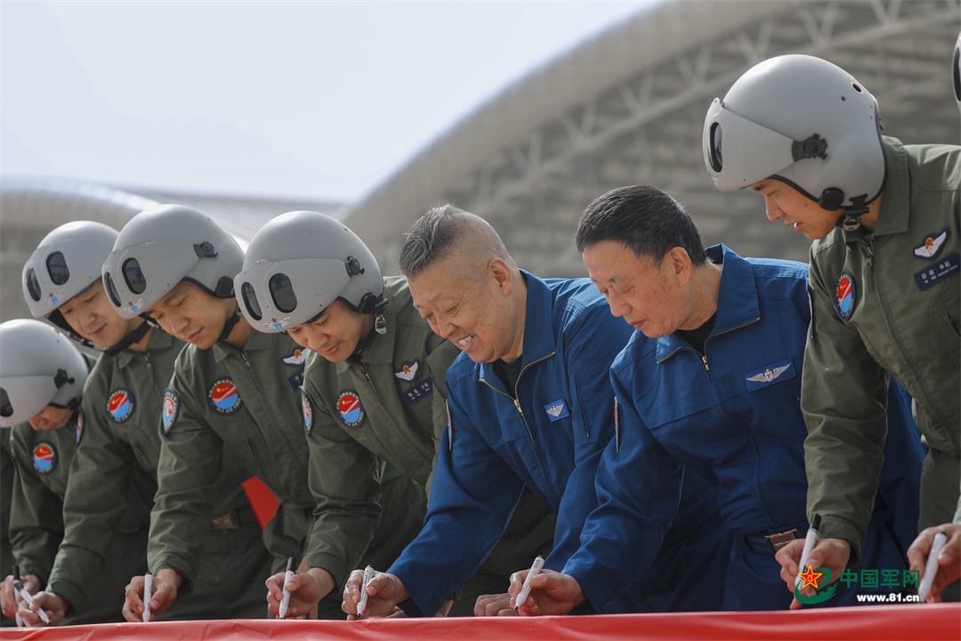 五四青年節前夕,航空兵某團組織“神威傳承”教育儀式。儀式現場,新老飛行員在“年輕鷹陣在黨旗指引下高飛遠航”橫幅上簽名。朱姜海 攝