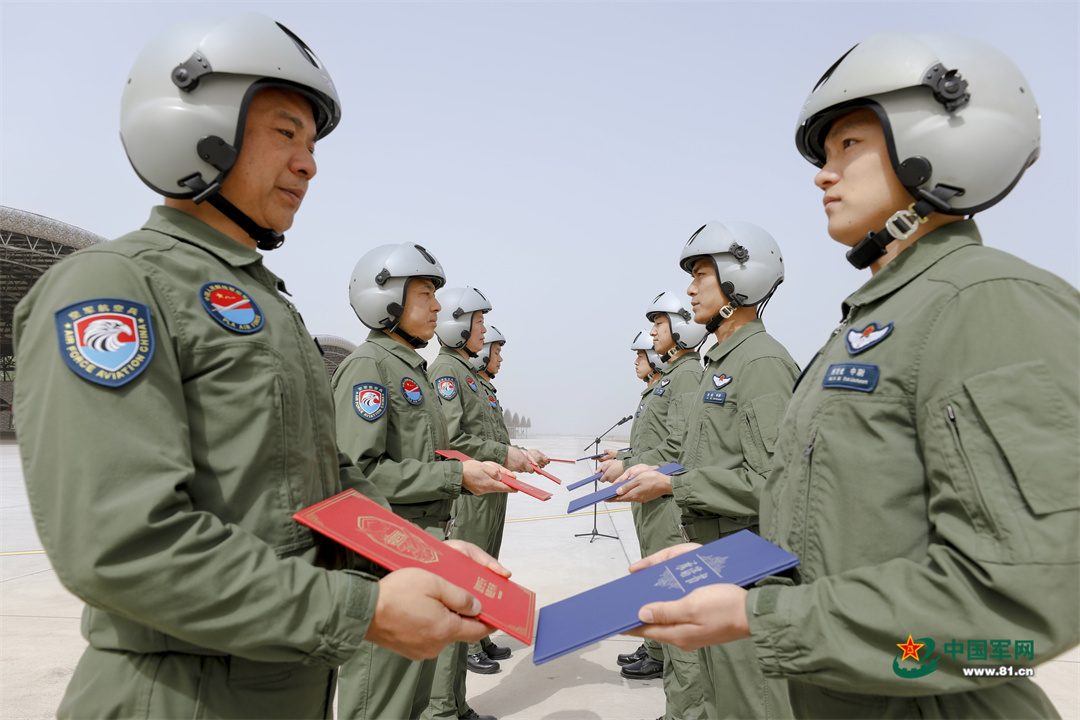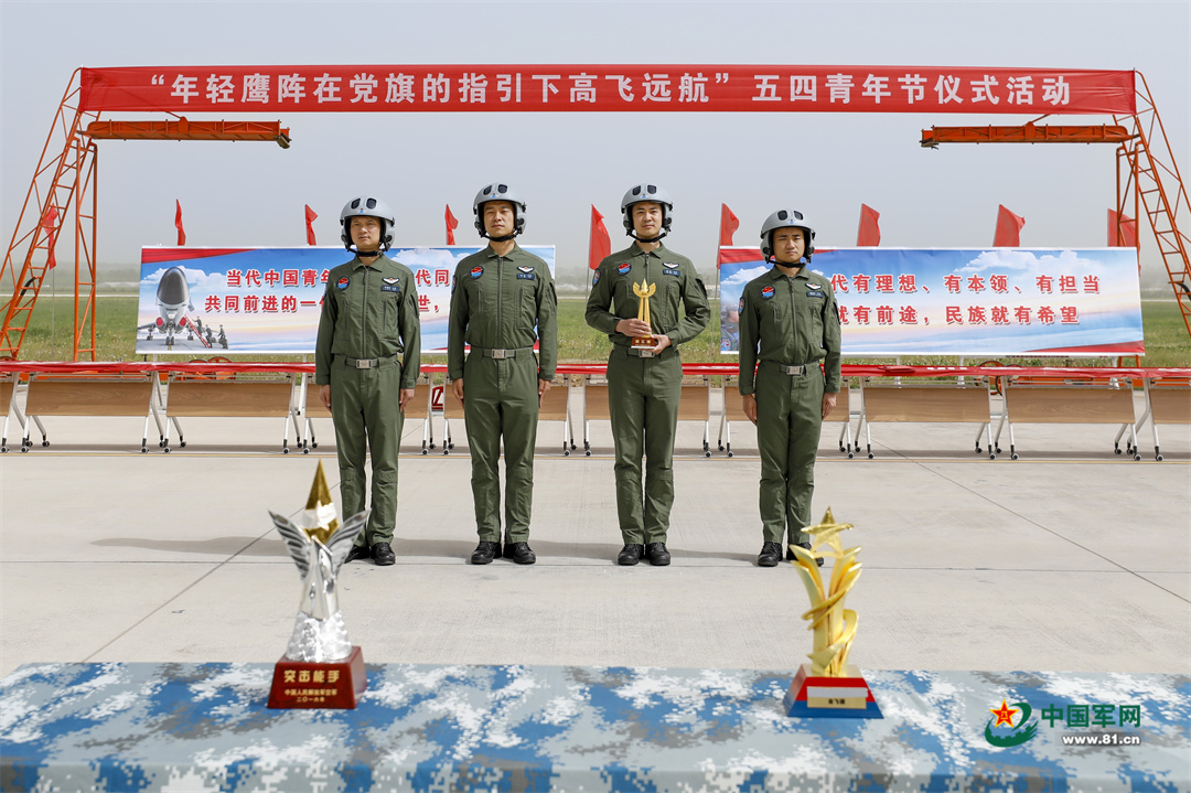五四青年節前夕,航空兵某團組織“神威傳承”教育儀式。儀式現場,年輕飛行員接過“金飛鏢”獎杯。龍小康 攝
