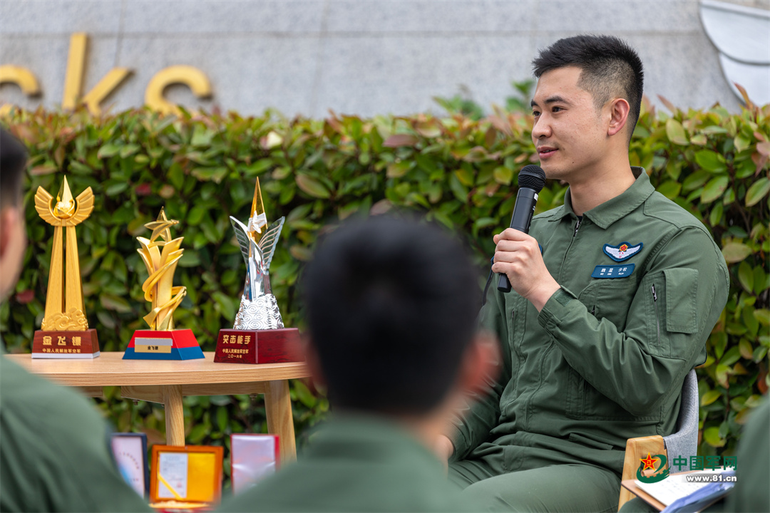 航空兵某團開展“跨越時空的青春對話”教育活動,邀請2位老飛行員回營參加?;顒蝇F場,年輕飛行員代表講述三奪“金飛鏢”的成長故事。龍小康 攝