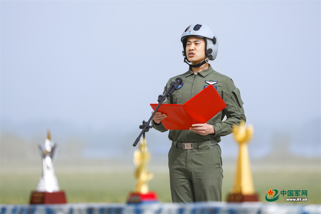 五四青年節前夕,航空兵某團組織“神威傳承”教育儀式。儀式現場,年輕飛行員代表發言。龍小康 攝