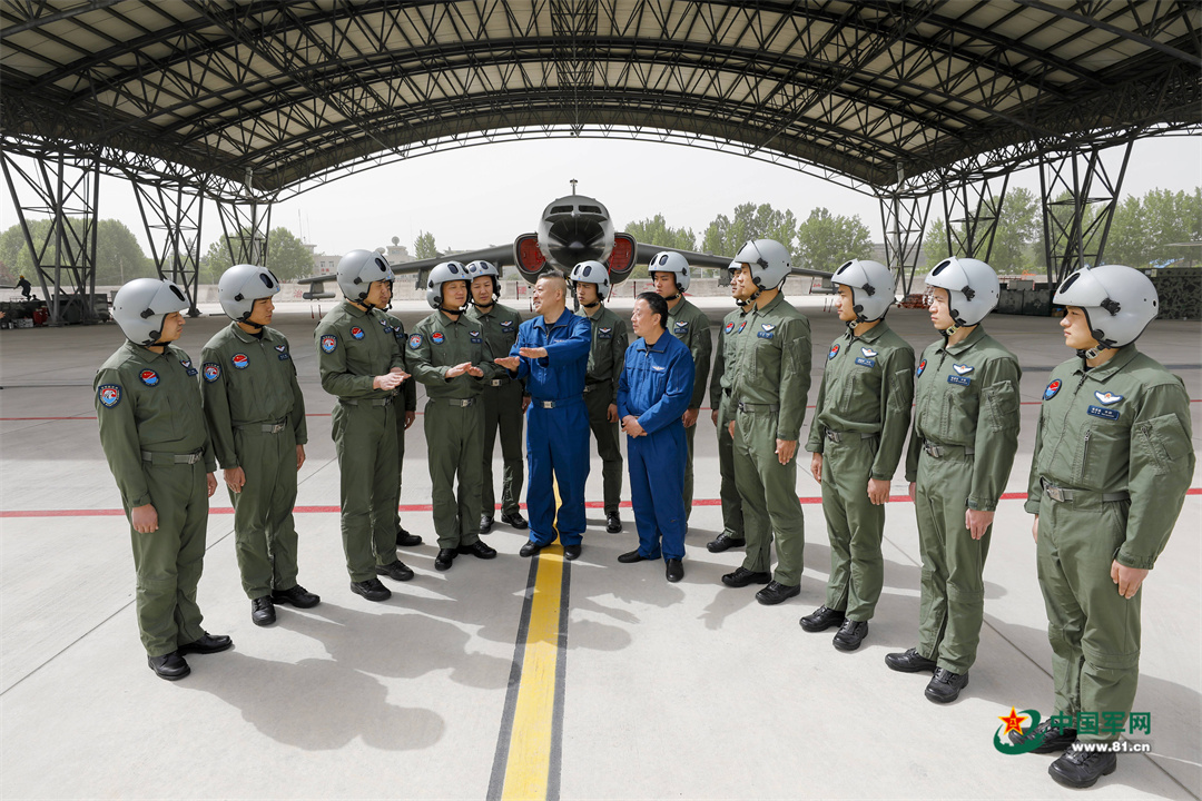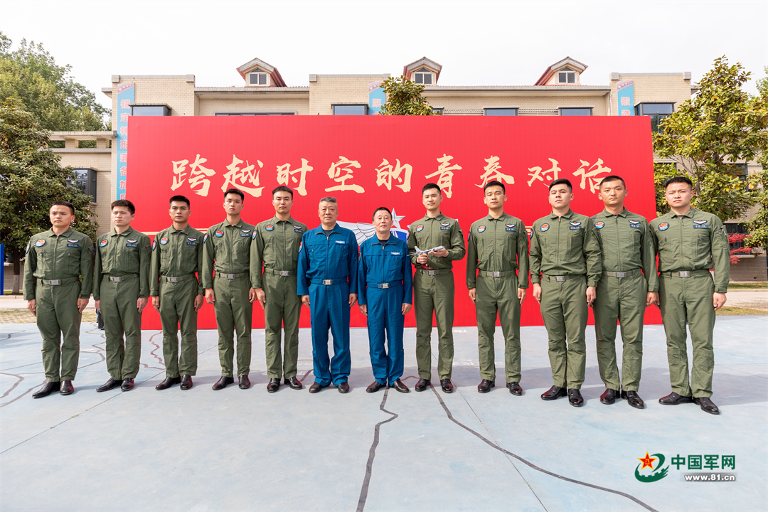 航空兵某團開展“跨越時空的青春對話”教育活動,邀請2位老飛行員回營參加?;顒蝇F場,新老飛行員合影留念。龍小康 攝