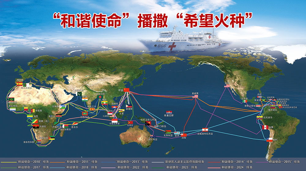 張曉剛:2010年以來,“和平方舟”號醫院船高揚仁愛之帆,先后10次執行“和諧使命”任務,航程32萬余海里,遍及3大洋6大洲,到訪52個國家和地區,提供37萬余人次醫療服務,用大愛仁心播撒“希望火種”,與到訪國民眾結下深厚情誼。今后,中國海軍將繼續執行“和諧使命”任務,用更多的“生命之舟”提供高質量公共安全產品,續寫踐行全球安全倡議、服務構建海洋命運共同體的溫暖篇章。