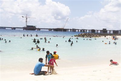 馬爾代夫海灘,人們游玩休憩。遠(yuǎn)處為正在建設(shè)的中馬友誼大橋。(圖片來(lái)源:人民日?qǐng)?bào) 鄒松攝)