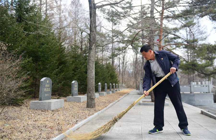 清晨5點,劉國信就從家趕往十幾公里之外、位于茫茫森林中的墓園。墓園里,13米高的烈士紀念碑高高矗立,“永垂不朽”的紅色碑文十分醒目。劉國信站在碑前,靜靜地凝視一會兒,才開始巡護墓園。