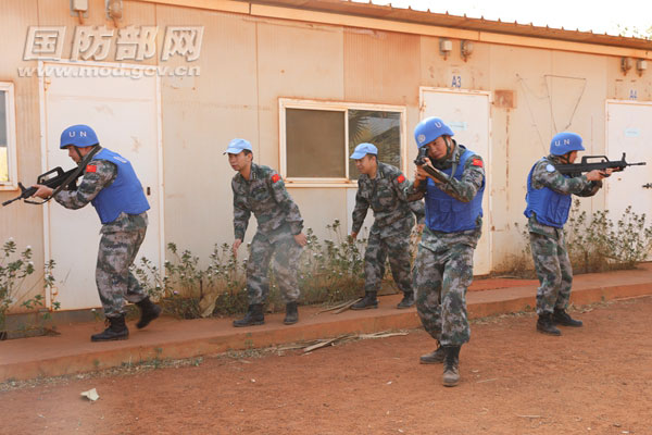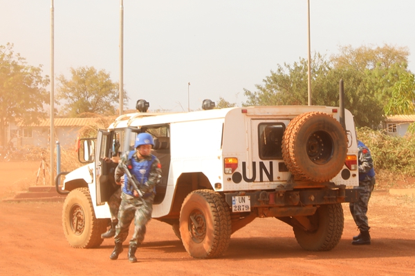 演練以維和營(yíng)區(qū)遭遇武裝騷亂為背景,重點(diǎn)突出安全防衛(wèi)、組織撤離、情況處置等環(huán)節(jié)的程序和方法。上午8時(shí),警報(bào)聲在分隊(duì)營(yíng)區(qū)響起,應(yīng)急演練正式開始,分隊(duì)官兵按照預(yù)案,緊急集結(jié),清點(diǎn)人員和裝具,戰(zhàn)斗一組以車輛、營(yíng)門工事為掩體,建立防御線,戰(zhàn)斗二組、三組迅速護(hù)送醫(yī)護(hù)人員、傷病員安全撤離。演練過程中,官兵嚴(yán)格遵循有關(guān)規(guī)定和要求,攝像取證,進(jìn)行喊話、拉槍栓、朝天鳴槍、警告射擊四步示警措施,依法穩(wěn)妥處置。