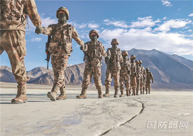 近日,因連續降雪,西藏阿里地區氣溫已降至零下28攝氏度。1月4日,阿里軍分區某邊防連巡邏分隊,按計劃對海拔4300多米的某執勤點進行巡邏。圖為巡邏分隊官兵手拉手通過冰面向點位前行。劉曉東攝