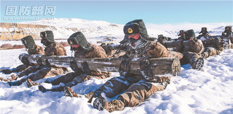 訓練中,官兵躺在厚厚的積雪上,抱著近50公斤的圓木,一次次完成負重仰臥起坐。盡管個個氣喘吁吁、唇邊結霜,但大家不懼嚴寒,激昂的口號震天響。