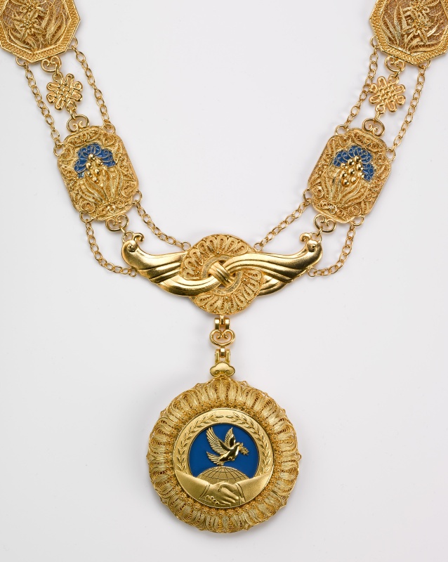 “友誼勛章”以金色、藍(lán)色為主色調(diào),章體采用和平鴿、地球、握手、荷花等元素,章鏈采用中國結(jié)、萬年青、牡丹、玉璧、蘭草等元素,整體使用花絲鑲嵌、掐絲琺瑯等傳統(tǒng)工藝手工制作,象征中國人民同各國人民友好團(tuán)結(jié)、友誼長存,祝愿世界各國共同繁榮發(fā)展。