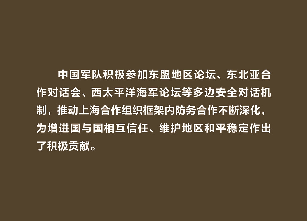 “為了和平 走向世界——慶祝中華人民共和國成立70周年國際軍事合作成就展”在中國人民革命軍事博物館向公眾開放。本次展覽全面綜合地展現了我軍對外交往合作發展歷程和豐碩的成果。國防部網編輯部制作系列稿件《國際軍事合作成就展》,帶您走進展覽。今日聚焦國際軍事合作成就展?:《第二部分 奏響軍事外交和平發展主旋律——與時俱進 拓展空間》。