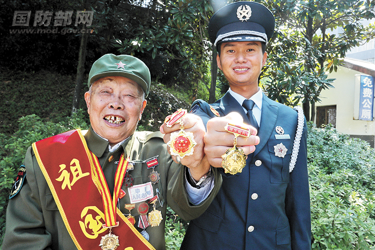 10月9日,在貴州省大方縣人武部,參加1949年開國大典閱兵儀式的老兵張治中與參加新中國成立70周年閱兵儀式的文職人員王勇聚在一起,交流閱兵體會,開展穿越時空的對話。