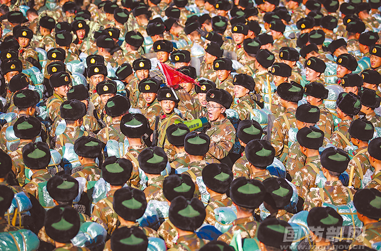 歲末年初,武警甘肅總隊新訓三大隊組織新兵冬季野營拉練。在行軍途中,他們通過開展簡潔明快的文化娛樂活動鼓舞官兵士氣。圖為排長洛桑扎西(持喇叭者)在人潮中演唱歌曲,為戰友們加油鼓勁。