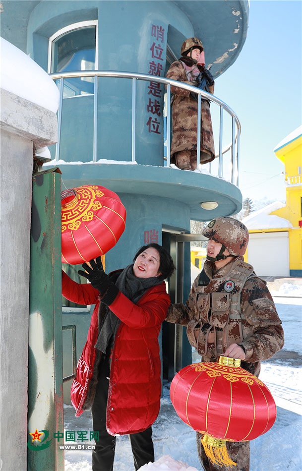 朱呈镕和維東哨所官兵一起掛上紅燈籠。朱武濤 攝