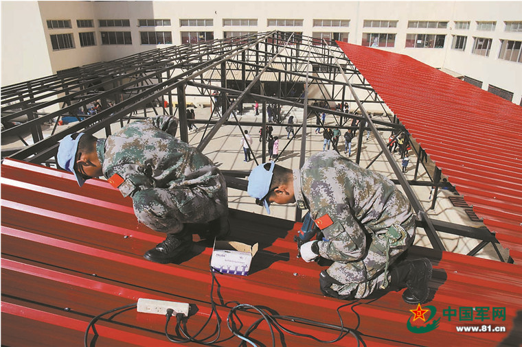 官兵頂著烈日在“中黎和平廣場”修建遮陽棚。