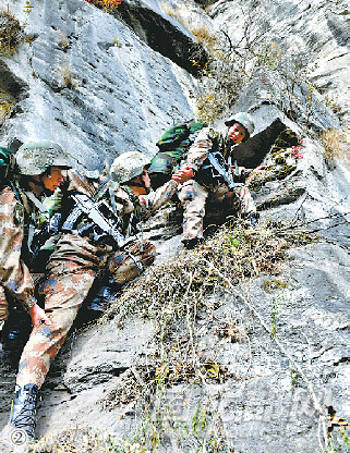 杜富強(上)在邊防線巡邏途中。馮 嘯攝