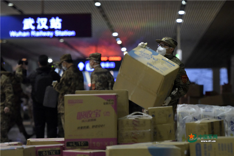 1月26日上午,全軍首批從遼寧沈陽(yáng)、山東菏澤緊急調(diào)撥衛(wèi)生物資抵達(dá)武漢,軍隊(duì)前方指揮協(xié)調(diào)組協(xié)調(diào)軍地雙方進(jìn)行物資交接。圖為官兵在漢口火車站迅速搬運(yùn)物資。解放軍報(bào)記者 范顯海 攝