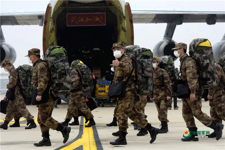 空地聯(lián)運(yùn),軍隊(duì)又一批1200名醫(yī)護(hù)人員抵達(dá)武漢。解放軍報(bào)記者 范顯海 攝