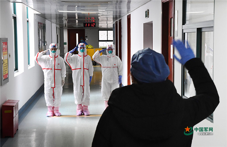 2月1日,陸軍軍醫(yī)大學(xué)醫(yī)療隊(duì)收治首批患者中兩人治愈出院。千言萬語化作軍禮致意。解放軍報(bào)記者 范顯海 攝