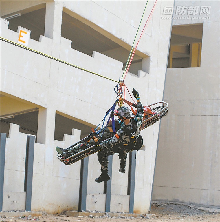 我軍官兵利用繩索轉運被困“受傷”人員。