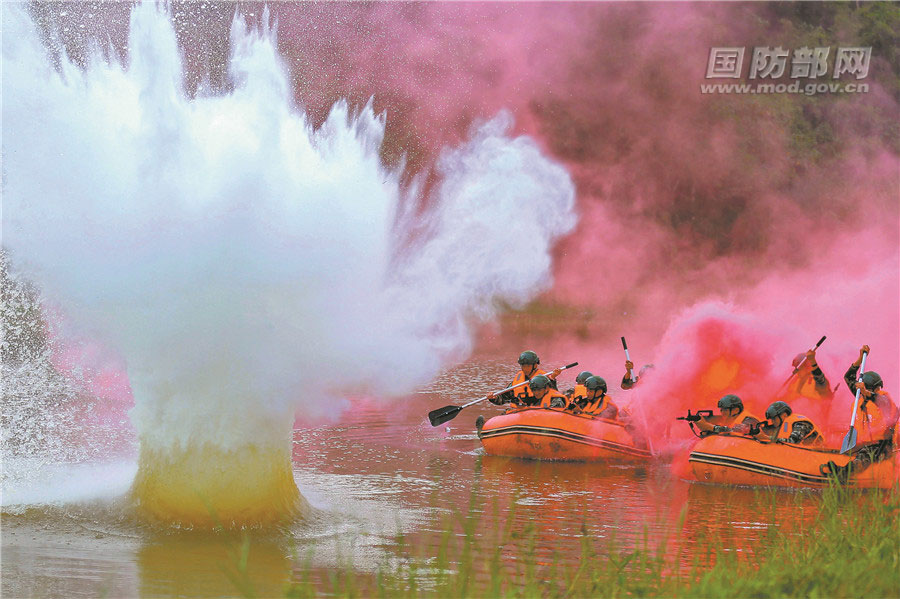 特戰(zhàn)小隊乘橡皮艇追剿逃竄“暴恐分子”。