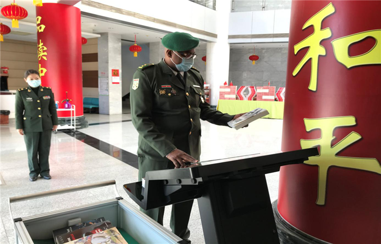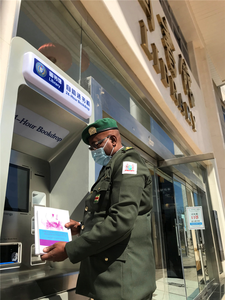 為防控疫情,減少人員流動(dòng)帶來(lái)的風(fēng)險(xiǎn),圖書館開展了點(diǎn)對(duì)點(diǎn)圖書服務(wù),在外軍學(xué)員宿舍樓一層大廳,擺放臨時(shí)書架,設(shè)置“習(xí)近平治國(guó)理政思想”主題專柜,精心挑選《習(xí)近平談治國(guó)理政》《擺脫貧困》《人類命運(yùn)共同體》等中國(guó)原創(chuàng)多種類、多語(yǔ)種圖書、期刊和DVD等,供學(xué)員們學(xué)習(xí)。他們還給學(xué)員發(fā)放了英、法等多語(yǔ)種的《新冠病毒肺炎預(yù)防手冊(cè)》等。