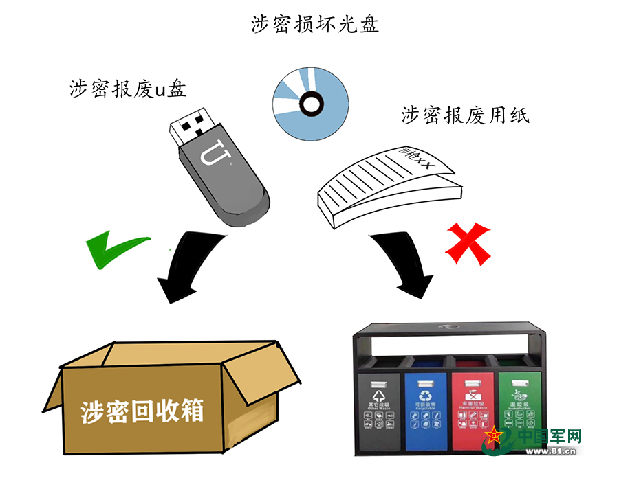 針對涉密物品管理,他們建立了涉密回收箱制度,規定日常工作中產生的廢紙、損壞的硬盤U盤、用過的光盤等都要統一回收處理。