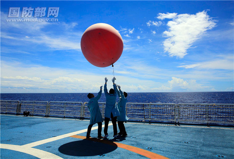 遠望5號船崗位人員利用晴朗的天氣施放信標球。王煦之 攝