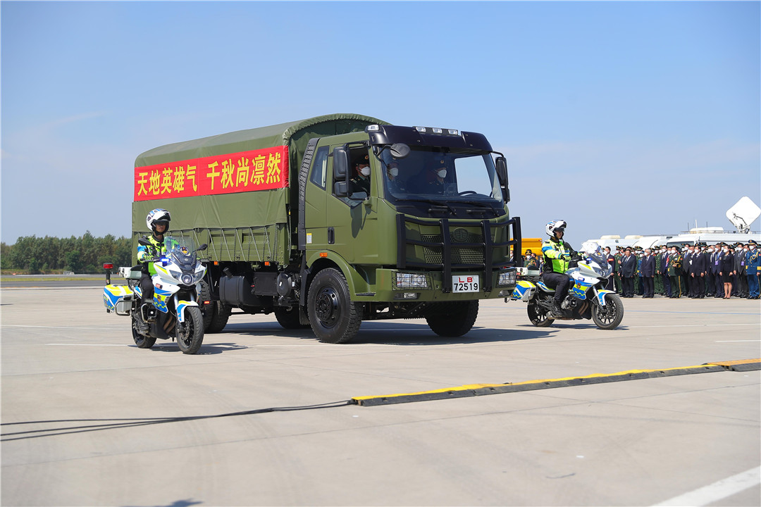 9月2日,載有志愿軍烈士遺骸的軍用車輛離開沈陽桃仙國際機場。 新華社記者 楊青 攝