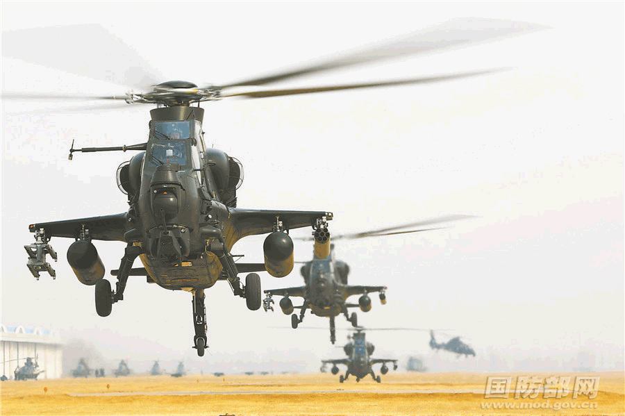2月24日,第80集團軍某陸航旅20余架戰機依次升空,進行突防偵察、戰術起降、伴隨護航等多個實戰化課目訓練。李騏光 攝