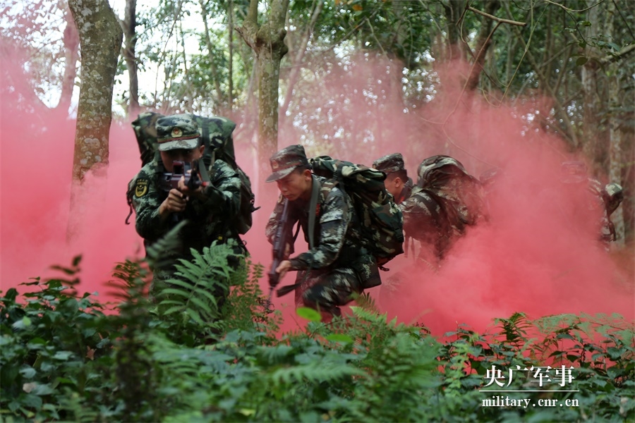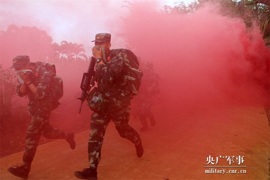拉練官兵在濃煙中搜索前進