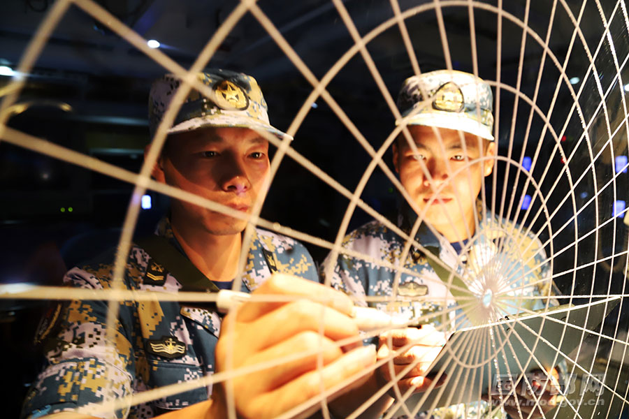 艦艇編隊(duì)高速航行途中,刺耳的警報(bào)聲驟然響起。官兵聞令而動(dòng),迅速進(jìn)入戰(zhàn)斗狀態(tài)。作戰(zhàn)室內(nèi),偵察數(shù)據(jù)快速傳送,各戰(zhàn)位人員緊盯屏幕,有條不紊傳達(dá)作戰(zhàn)指令。官兵利用雷達(dá)、紅外、光電等探測(cè)手段加強(qiáng)??账阉鳎嘈脱b備在海天之間織網(wǎng)布陣。