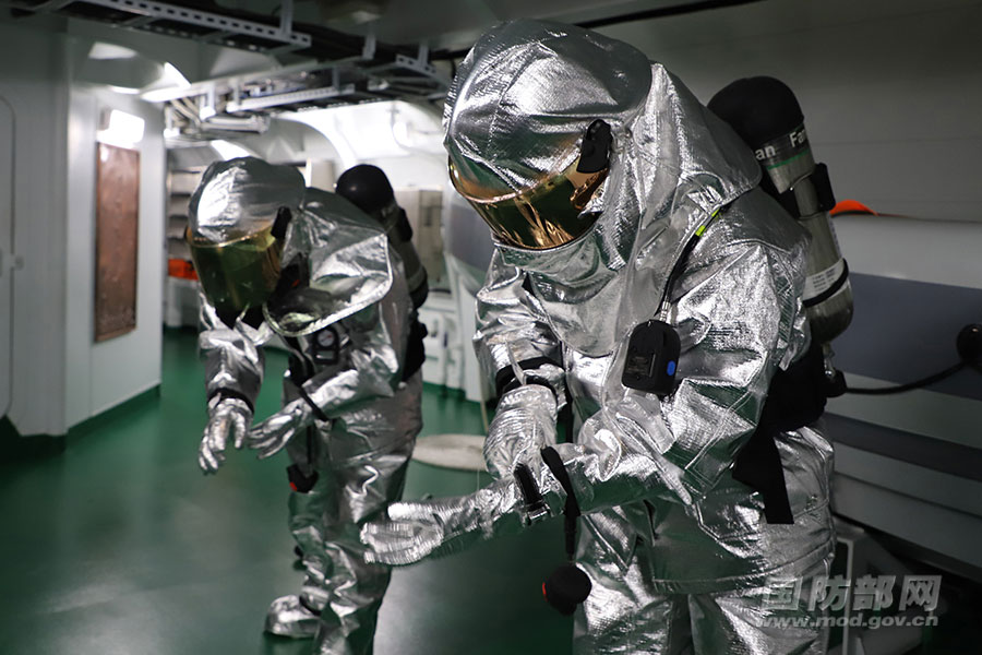 損管隊(duì)員快速穿戴防火服。