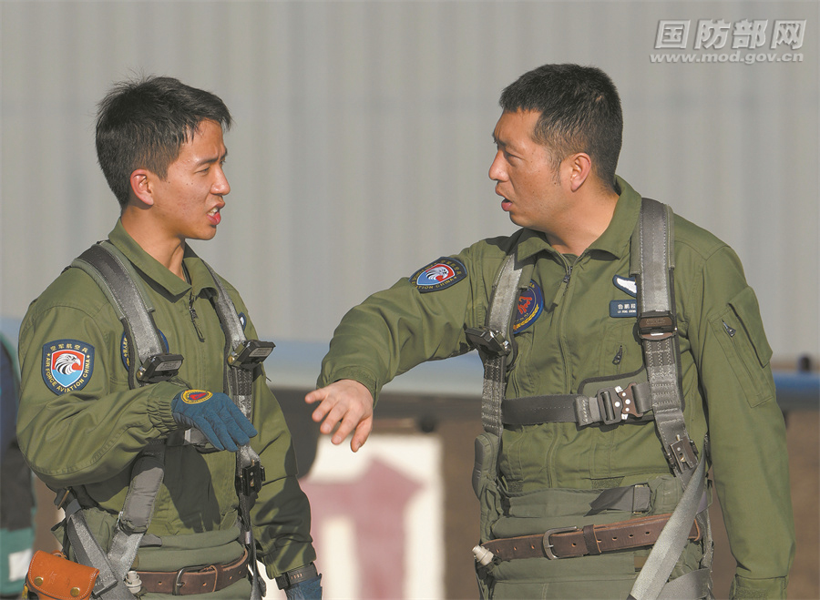 剛下戰(zhàn)機(jī),新員(左)與教官便討論起戰(zhàn)術(shù)動(dòng)作。
