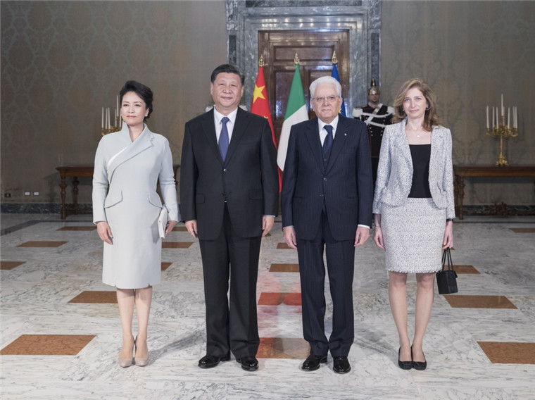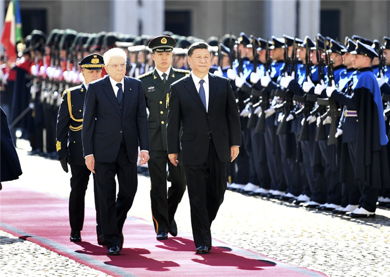 習(xí)近平和夫人彭麗媛抵達時,馬塔雷拉總統(tǒng)和女兒勞拉在停車處迎接,互致問候。隨后,軍樂團奏中國、意大利兩國國歌,升中國國旗。兩國元首一同檢閱儀仗隊。儀仗隊長趨前請習(xí)近平檢閱。習(xí)近平在馬塔雷拉總統(tǒng)陪同下依次檢閱陸軍、海軍、空軍和騎兵方隊。習(xí)近平同意方主要官員握手,馬塔雷拉總統(tǒng)同中方陪同人員握手。
