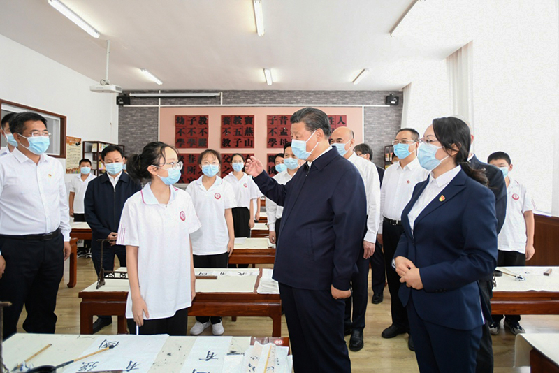 2021年9月13日至14日,中共中央總書記、國家主席、中央軍委主席習近平在陜西省榆林市考察。這是14日上午,習近平在綏德實驗中學考察時,同正在練習書法的學生親切交流。 新華社記者 李學仁/攝