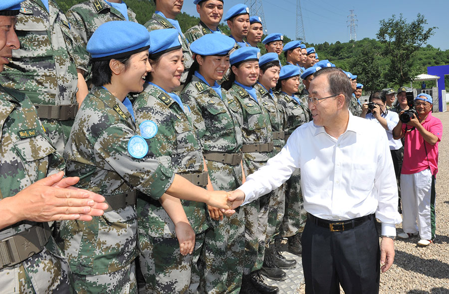 2013年6月,時任聯合國秘書長潘基文在中國國防部維和中心與官兵交流互動。