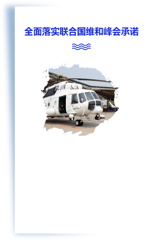 2015年9月28日,中國國家主席習(xí)近平出席聯(lián)合國維和峰會(huì),宣布支持聯(lián)合國維和行動(dòng)的6項(xiàng)承諾。中國軍隊(duì)堅(jiān)決貫徹落實(shí)習(xí)近平主席決策部署,言必信、行必果,以實(shí)際行動(dòng)履行相關(guān)承諾,取得一系列重要成果。